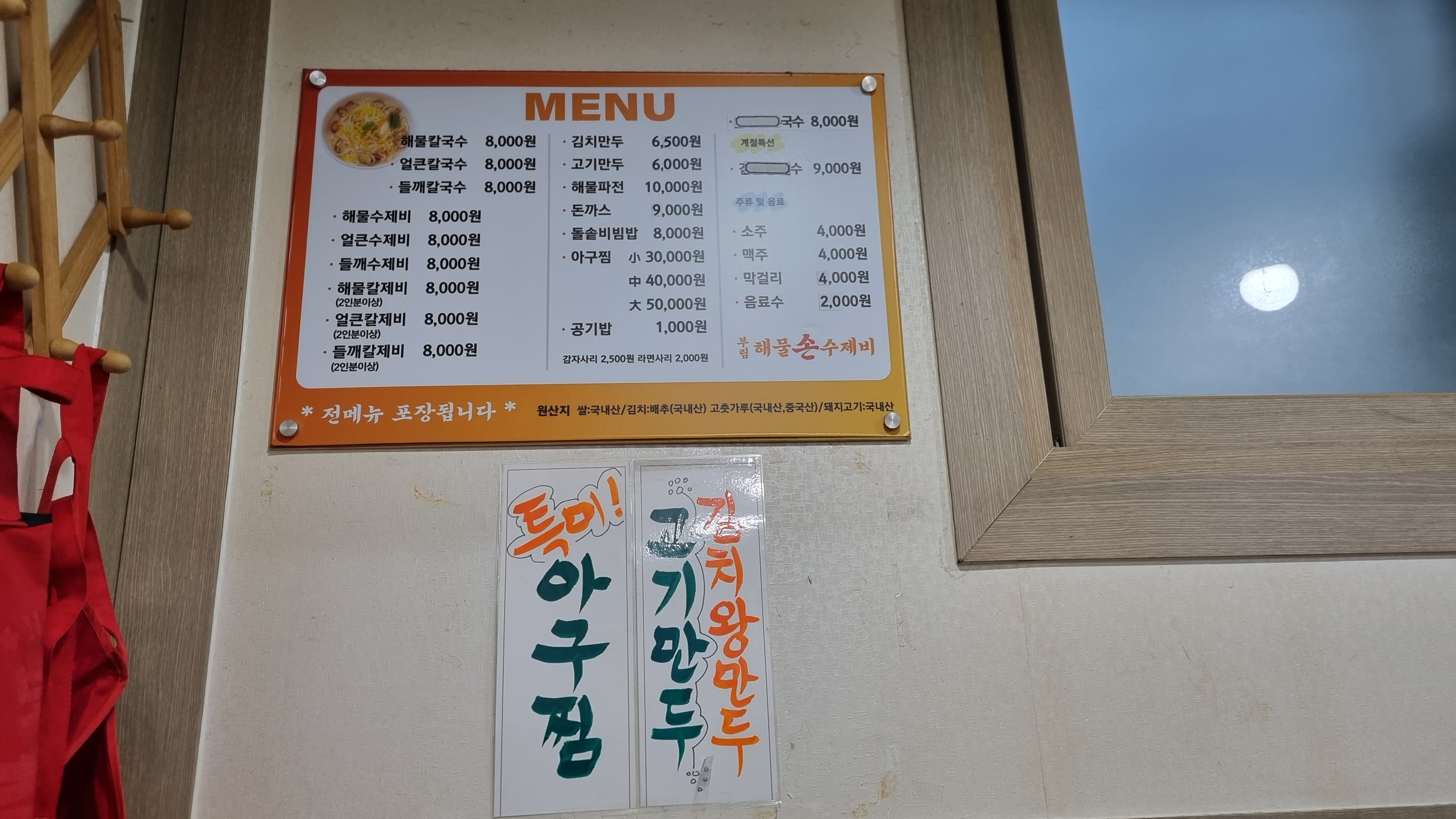 드레스셔츠를 입은 분들을 배려하기 위해 앞치마가 마련되어 있는 모습이 인상적이었습니다. 앞치마 달라고 말하기도 미안해질 때가 있는데 이렇게 미리 준비되어 있는 곳은 배려가 느겨집니다. 저희는 이날 해물칼제비 2인분을 주문하였습니다. 칼국수도 먹고 싶고, 수제비도 먹고 싶을 때 칼제비가 딱이죠~ 칼제비는 2인분부터 주문 가능하여 저희는 고민하지 않고 칼제비로 메뉴를 정했습니다.