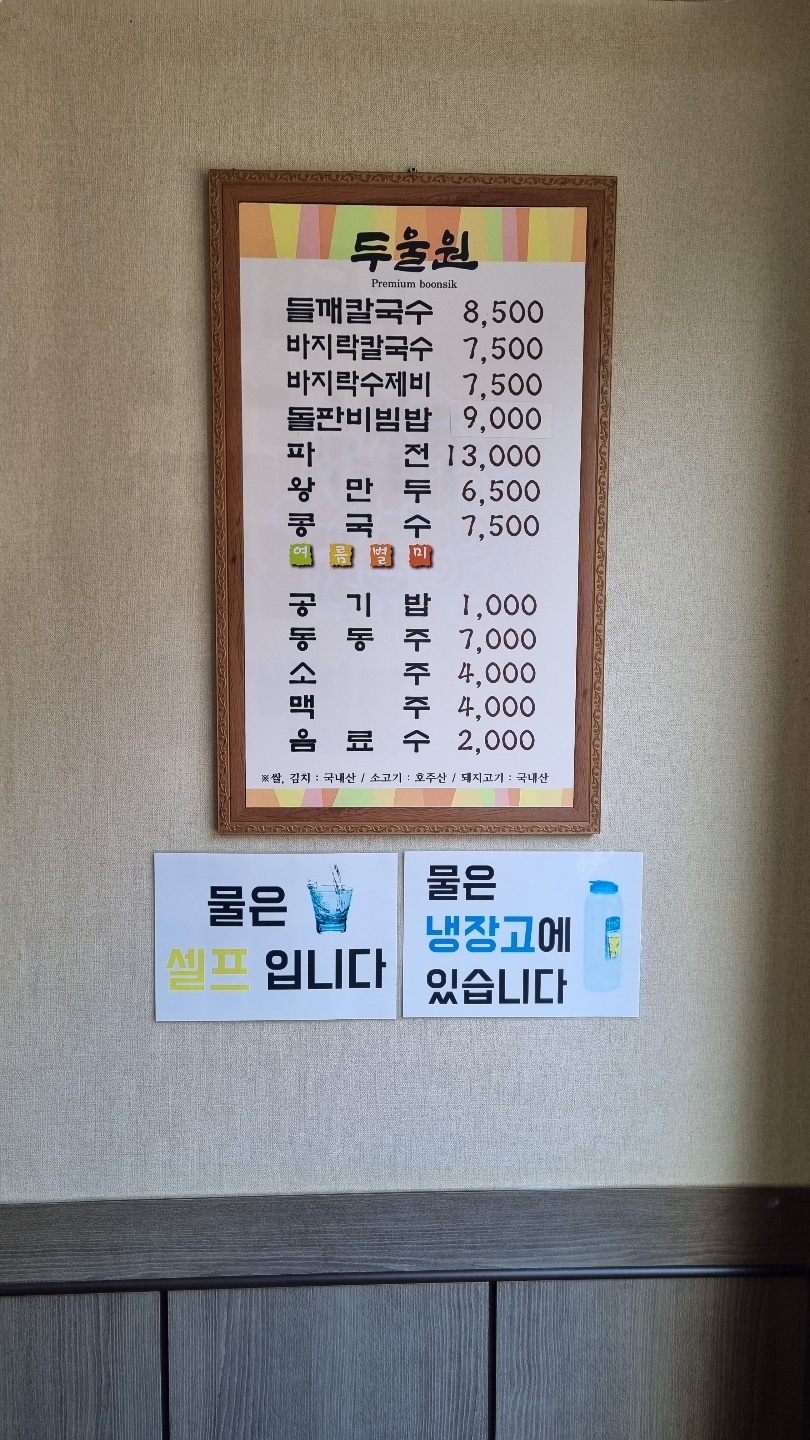 메뉴판입니다. 물가가 치솟는 요즘 그래도 이 가격에 한끼 든든히 먹을 수 있다는 게 다행입니다. 들깨칼국수는 바지락칼국수보다 천원 높으며, 파전도 판매합니다. 사실 저흰 이날 다른 가게를 가려다 파전 냄새에 이끌리듯 두울원을 찾게 되었습니다^^ 손님이 많아 매장 사진은 찍지 않았는데 입식테이블 뿐만 아니라 좌식테이블도 있어서 경우에 맞게 이용하실 수 있습니다.