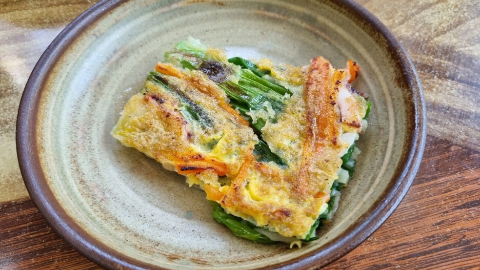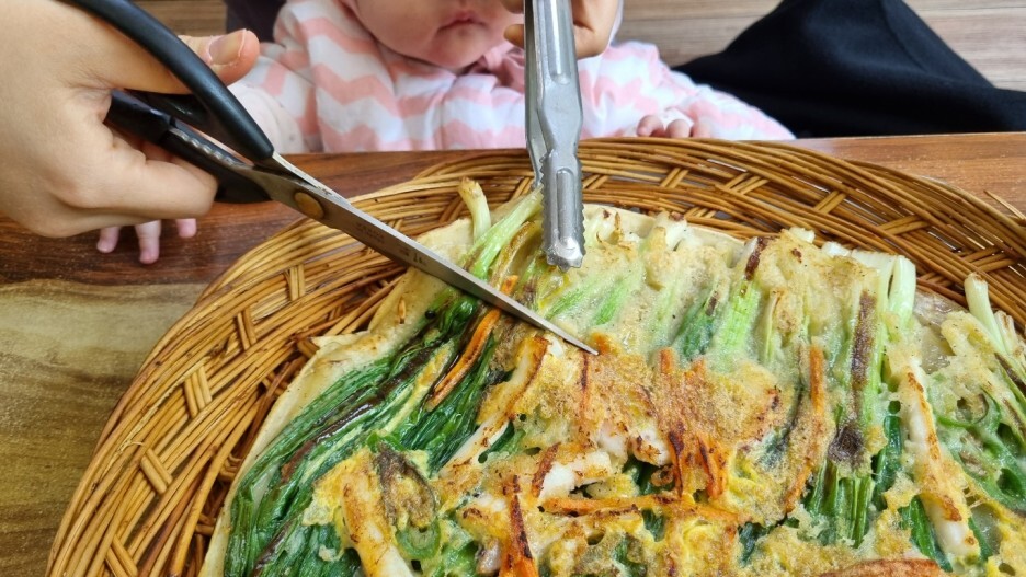 저희는 이날 바지락칼국수와 파전을 주문했습니다. 파전에 파도 큼지막하게 부쳐져 있어 식감이 좋았습니다. 다만 오징어 등 해물이 많은 편은 아니었으며, 바삭하기보단 촉촉한 편에 가까워 조금 아쉬웠습니다.